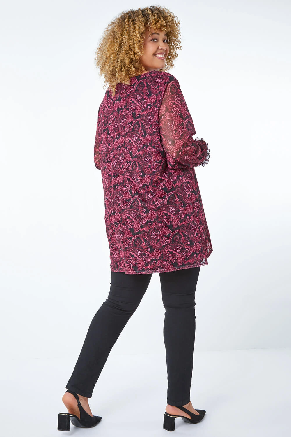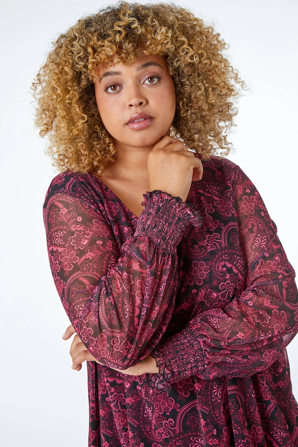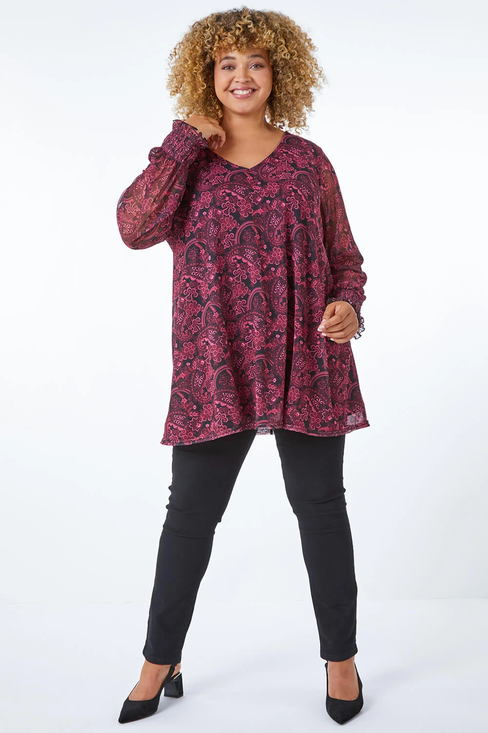 Carry pretty paisley prints through to the new season with this curve, paisley print, mesh top. Cut from a stretch, jersey fabric this piece features a feminine v neckline and full length, sheer, sleeves with thick shirred cuffs. It’s adorned in a striking, dark paisley print, in contrast colours. Designed to pull on overhead for fuss free dressing, this top is perfect for your everyday. Add leather look trousers and heeled boots for a cute but casual look!