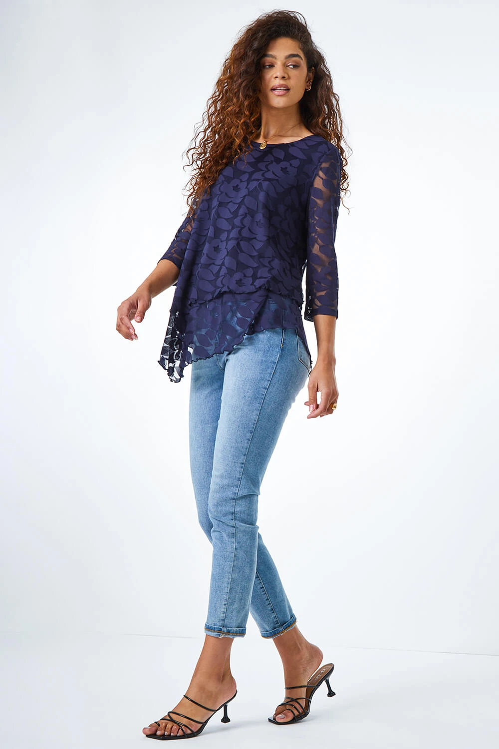 Add a touch of colour to your winter wardrobe this season with this leaf print mesh top. Crafted in a leaf print design this top offers a round neckline with 3/4 length sleeves, a jersey lining and with an asymmetric hemline that finishes at low hips. Can be worn with jeans and chunky boots or for an evening look simply add heels and faux leather leggings.
