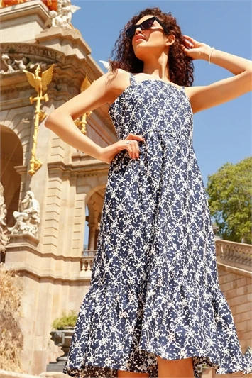 Feminine and fun for the new season, this pretty fit and flare dress is just what your wardrobe needs! Decorated with broderie flowers, this gathered style finishes at a midi length with a scallop hem. The linen cotton blend material makes this dress so light and breathable for the Summer. It has a sleeveless shape, cami straps and a sweetheart neck with button front. It has a stretch shirred back, making it easy to pull on and go. Style with a denim jacket and pumps for casual Spring outfits!