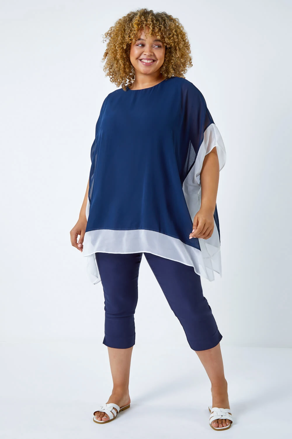 Flattering and floaty this feminine, chiffon overlay top is new to our curve collection. Cut from a smooth, chiffon fabric this piece features a modest round neckline and short sleeves. Its overlay style creates a contrast border at the hem line adding striking detail. A jersey inner provides comfort and coverage. Designed to pull on overhead with no tricky fastenings, this piece is perfect with smart trousers and heels or cropped stretch trousers and sandals for a more casual look!