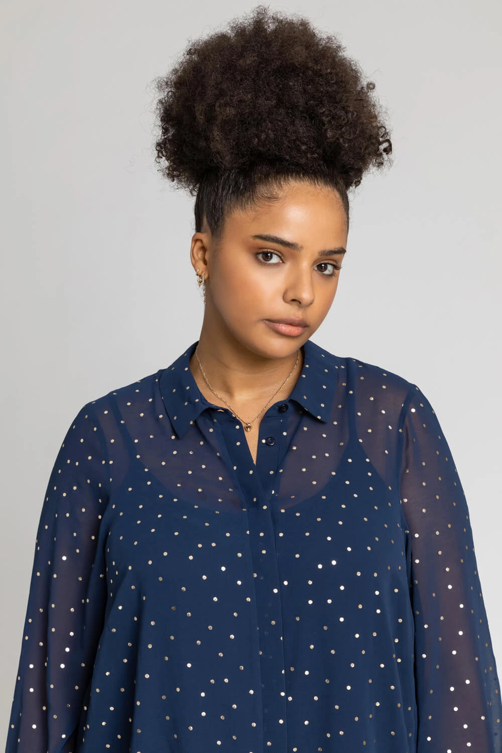 Make an impression with our longline foil spot shirt in our Curve collection. Cut with a relaxed shape, shirt collar and long sleeves, this long blouse is adorned instunning gold polka dots. Complete with an inner cami top, this party number looks great with faux leather trousers.