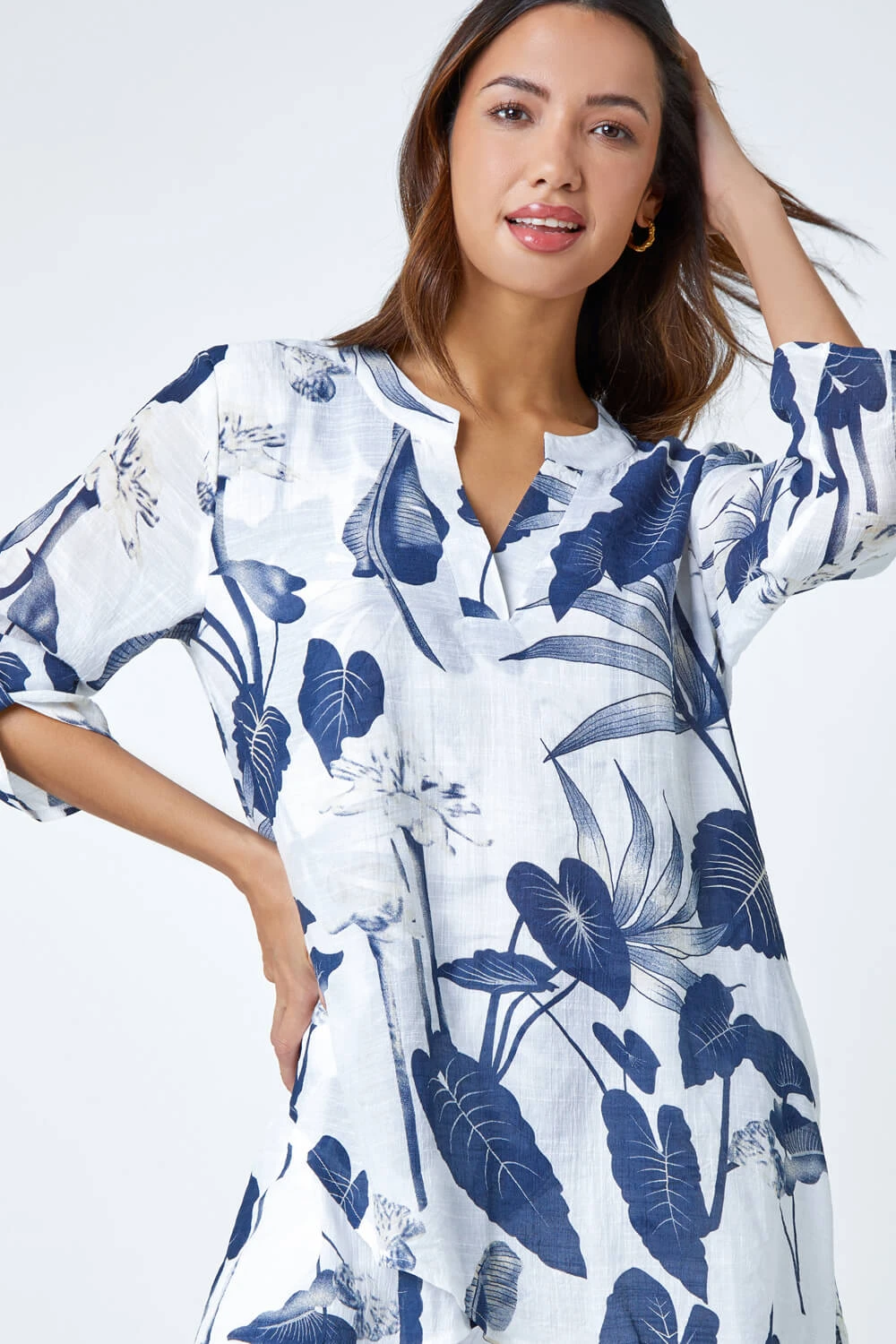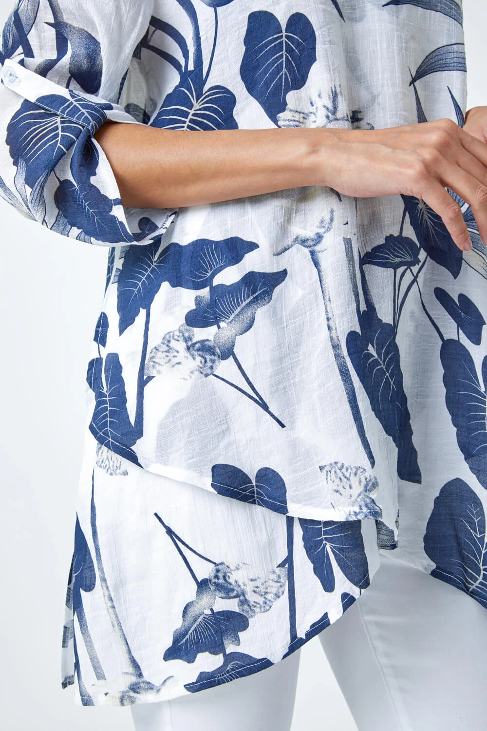Pretty palm prints are key for the warmer months and this light weight, wrap hem shirt showcases them beautifully. Cut from a printed, woven fabric this piece features a feminine v neckline and fun 3/4 length sleeves. Designed in an oversized, longline tunic style this is both comfortable and stylish. Add cropped jeggings and sandals for a fuss free but fashionable look!