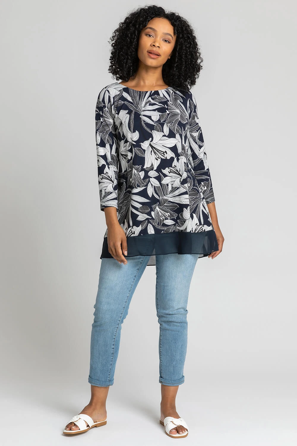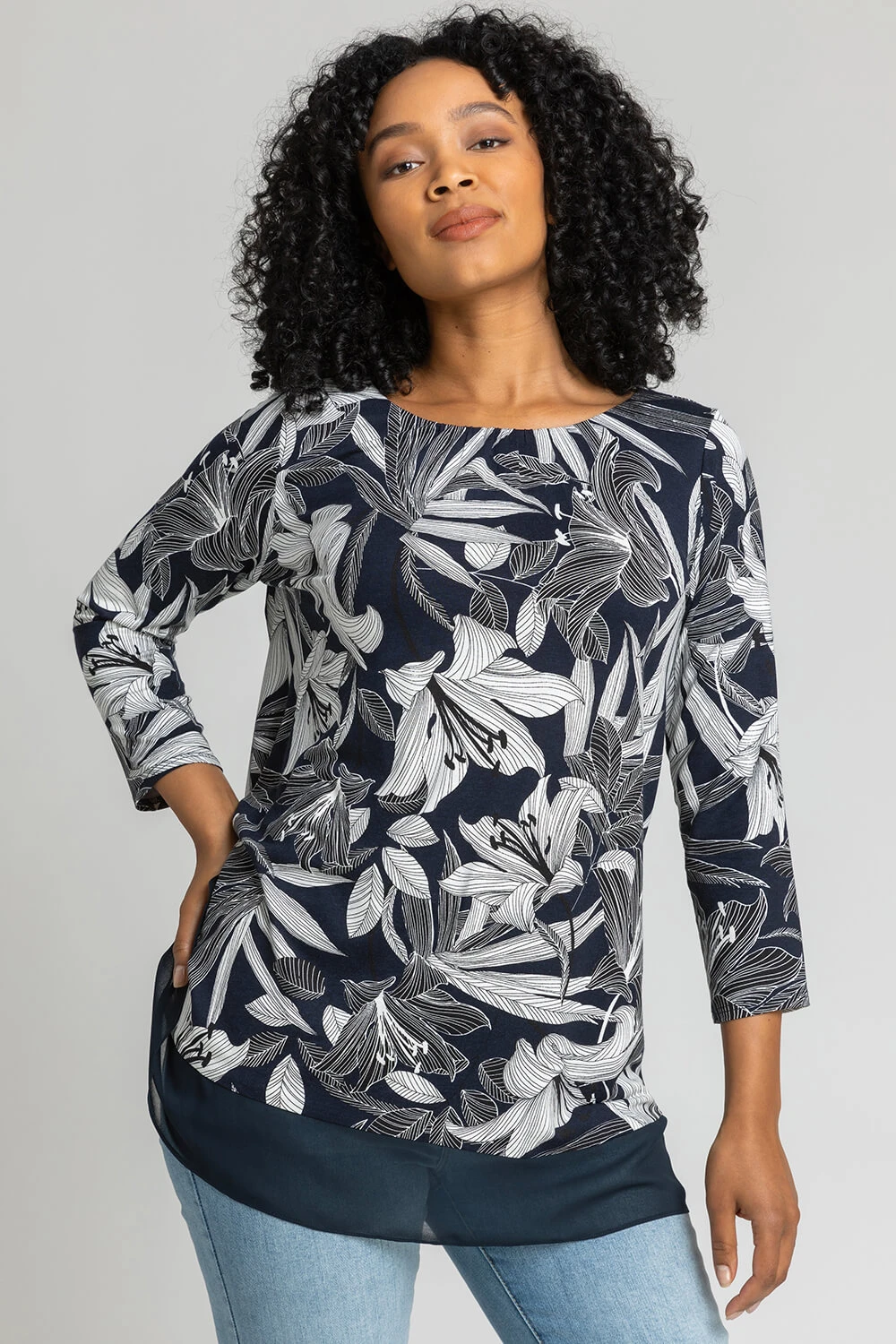 A timeless favourite from our Roman collection has just got better with its new Petite shape and fit. Ideal for dressing up or down, this wardrobe winner can be worn for smart or casual occasions. This chiffon hem style is so flattering with 3/4 length sleeves and a bold lily floral print. Add tailored trousers and court heels for the workplace or add denim crops and pumps for an effortless weekend ensemble.