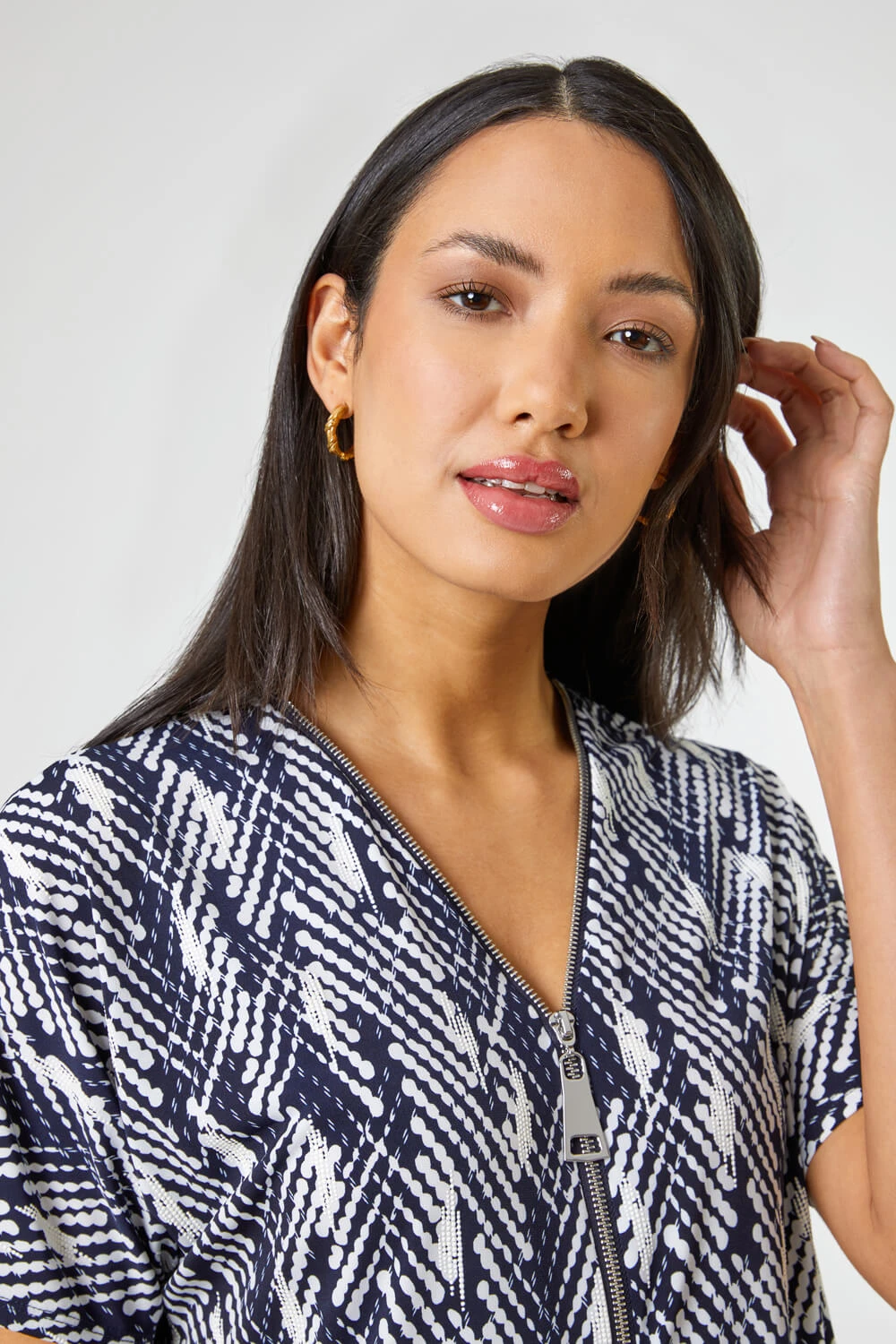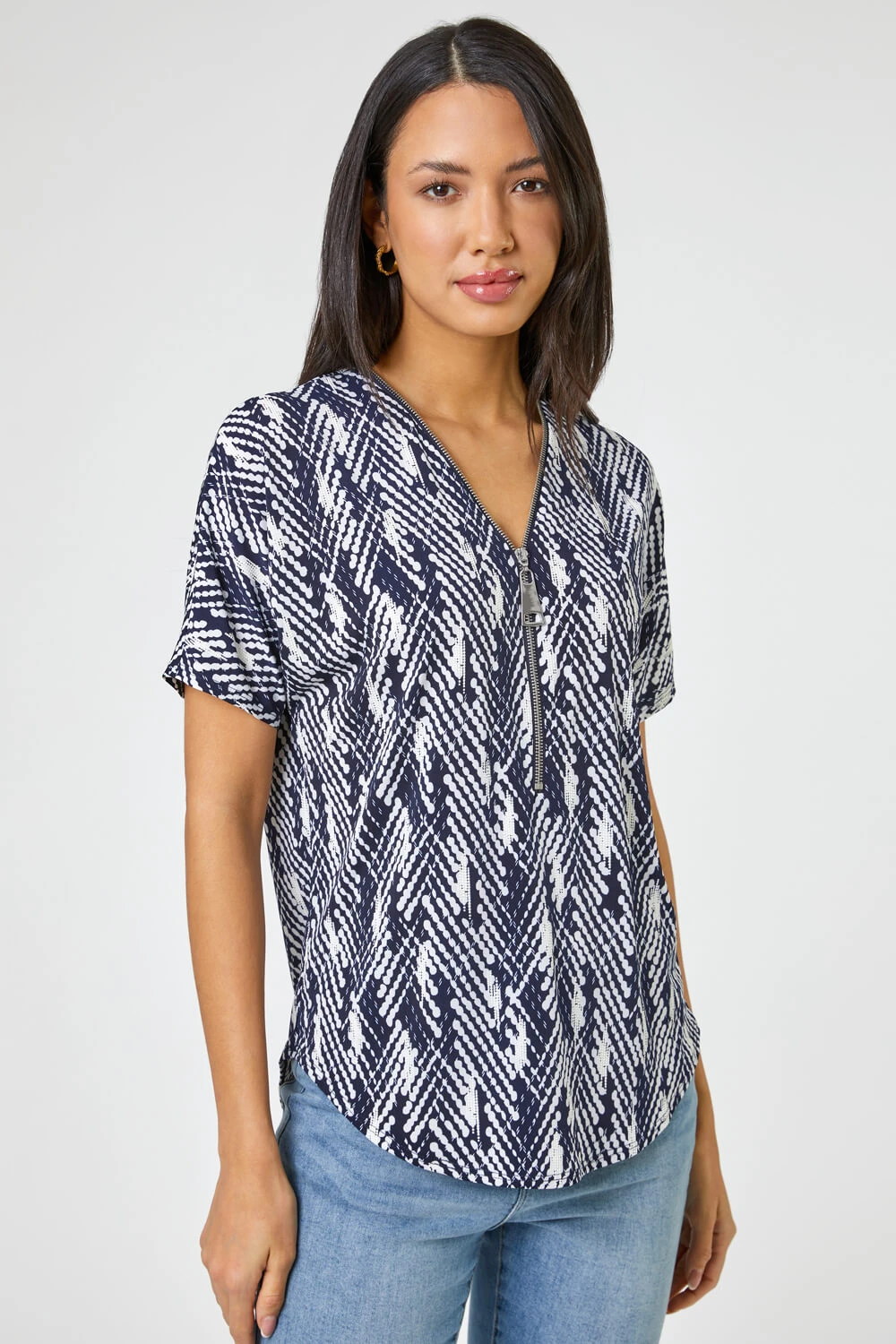 Stand out from the crowd in this statement textured abstract print top, perfect for your spring summer days! This v neck style features a functional zip, short sleeves and a rounded hemline. Easily dressed up or dressed down, style with our cropped bengaline trousers or denim jeans, it’s the ultimate piece for your wardrobe that is just right for any occasion.
