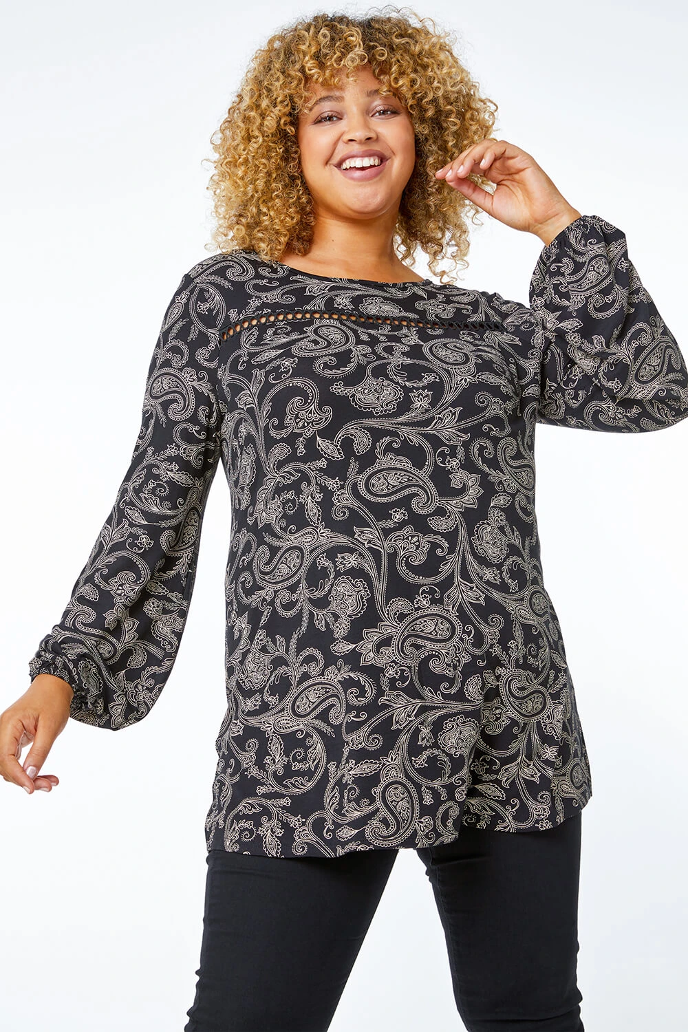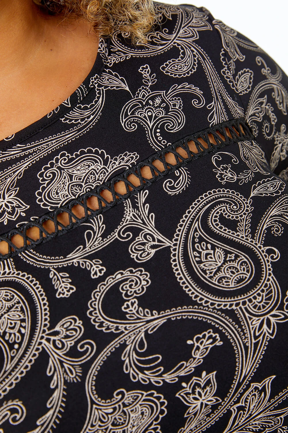 Take pretty paisley prints through to the new season with this printed curve top. Cut from a comfortable, stretch jersey fabric this features full length sleeves with elasticated cuffs. It features a modest, round neckline and delicate ladder lace detail across the chest for an extra element. Add mom jeans and boots for an on trend, off duty look!