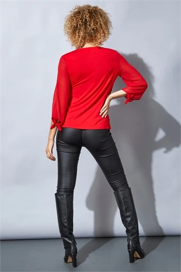 Add this simple Summer staple into your every day wardrobe! Cut from a lightweight chiffon, with a stretch jersey blouson hem, this flattering piece is an easy option for any smart occasion. This top is detailed with a round pleated neckline for a flattering finish and a floaty short sleeve. It comes with a detachable ring necklace to effortlessly accessorise from day to night. We’d pair this piece with some smart trousers and a heel for a professional look or dress it down with jeans for a night out with the girls!