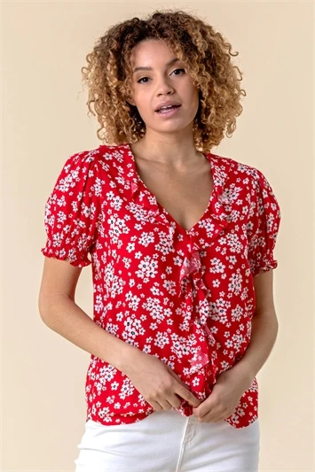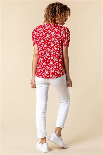 Exude Summer energy in this lightweight jersey top. Detailed with floaty chiffon short sleeves, feminine v-neckline and shirred stretch blouson hem, this piece is an easy wardrobe staple. Ideal for dressing from day to night, this smart casual piece has a stretch jersey pull on silhouette that is effortlessly stylish. Pair with cropped trousers and sandals for a holiday ready daytime style.