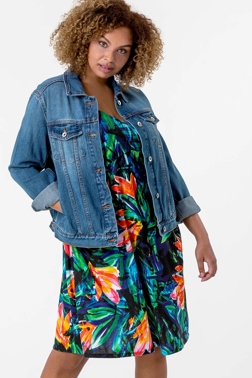 Spice up your seasonal wardrobe with this tropical piece! Our V-neck strappy summer dress is a fun, knee-length dress that is perfect for packing in your holiday suitcase. This wide strapped dress is cut from a stretch fun all-over print fabric. The shaped empire waistline flatters the curves and did we mention that it has pockets? Pack this fun piece in your suitcase and pair it with sandals for a striking look in seconds.