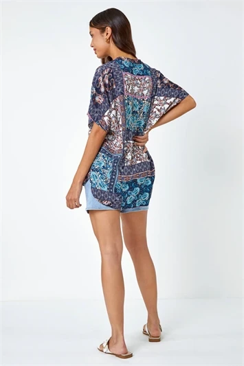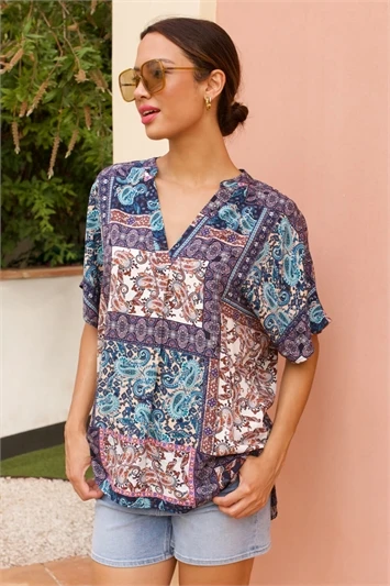 Bring print into your wardrobe this season with this paisley printed overshirt. Cut from a stretch jersey and adorned in a vibrant floral print, this Summery piece is detailed with floaty 3/4 length sleeves, a smart button detail and notch neckline, to make a breezy seasonal statement. Wear this relaxed fit blouse with some cropped trousers and chunky sandals for a look to take you through those casual Spring days.