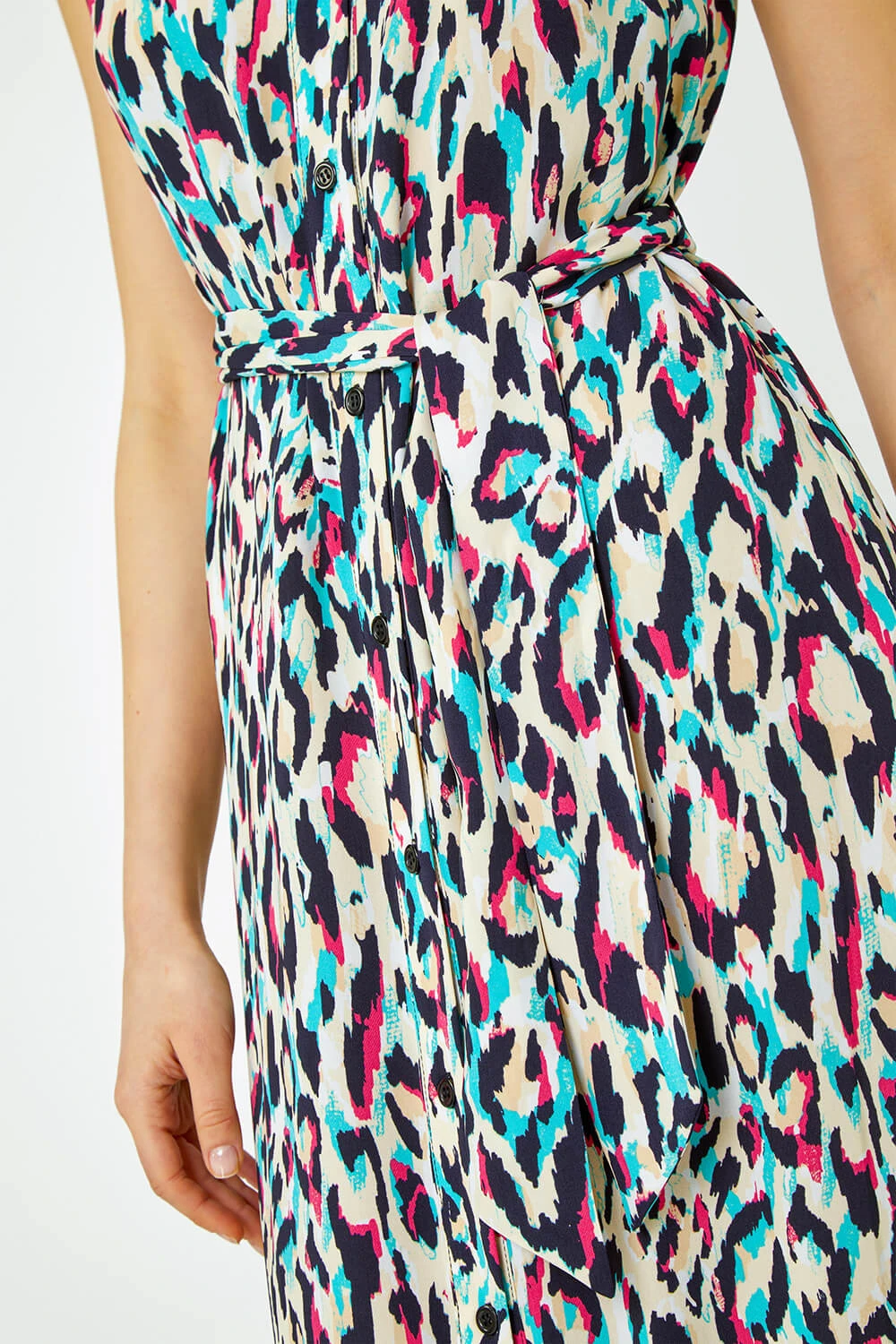 A tie waist shirt dress will always be in style! Cut to a timeless silhouette, this v-neckline is finished with a smart shirt collar and vibrant leopard print. This midi length dress is topped off with subtle side splits and a self tie belt. Made from a lightweight woven fabric with short sleeves, this style is perfect for Spring Summer and can be worn with a denim jacket and sandals for the ultimate daytime look.