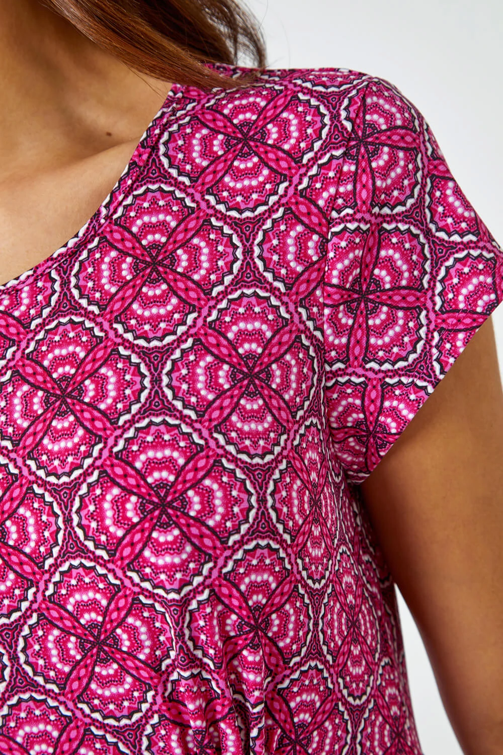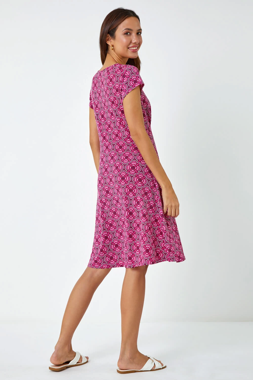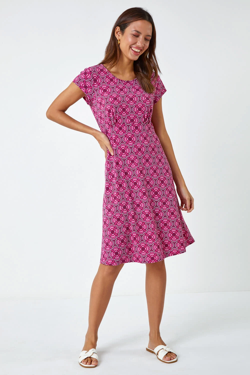 Adorned in an on trend geo print this fun, knee-length dress is cut from a stretch jersey fabric for guaranteed comfort. With a modest round neckline and cool, cap sleeves, this piece is perfect for the warmer weather. It’s finished with a flattering elasticated, gathered waist and falls in soft pleats in a fit and flare style. Pair with sandals and a lightweight jacket for effortless style!