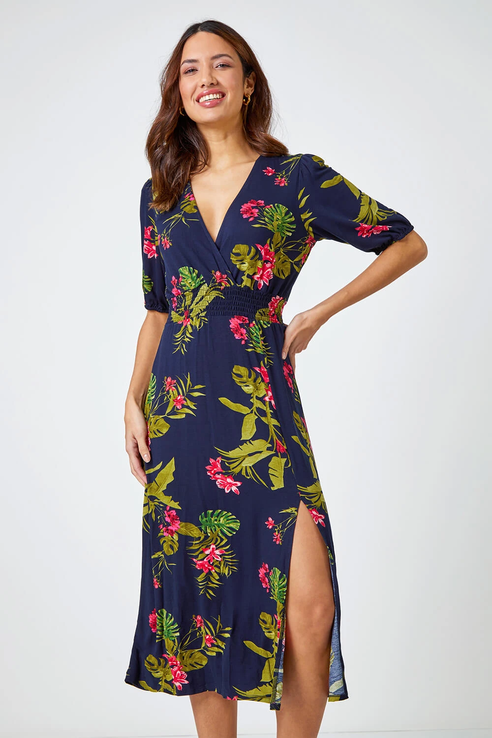 Stroll into Summer in style with this tropical inspired midi dress. Crafted from a lightweight material, this new season style boasts a side split detail, flattering wrap neckline and comfortable shirred waist. So easy to pull on and go, this versatile dress can be worn for any occasion. Pair this short sleeve style with wedge heels for holiday or sandals and a denim jacket for a Spring daytime look.