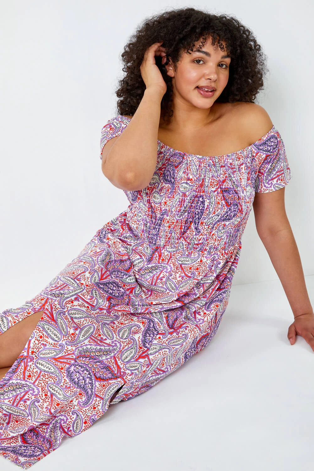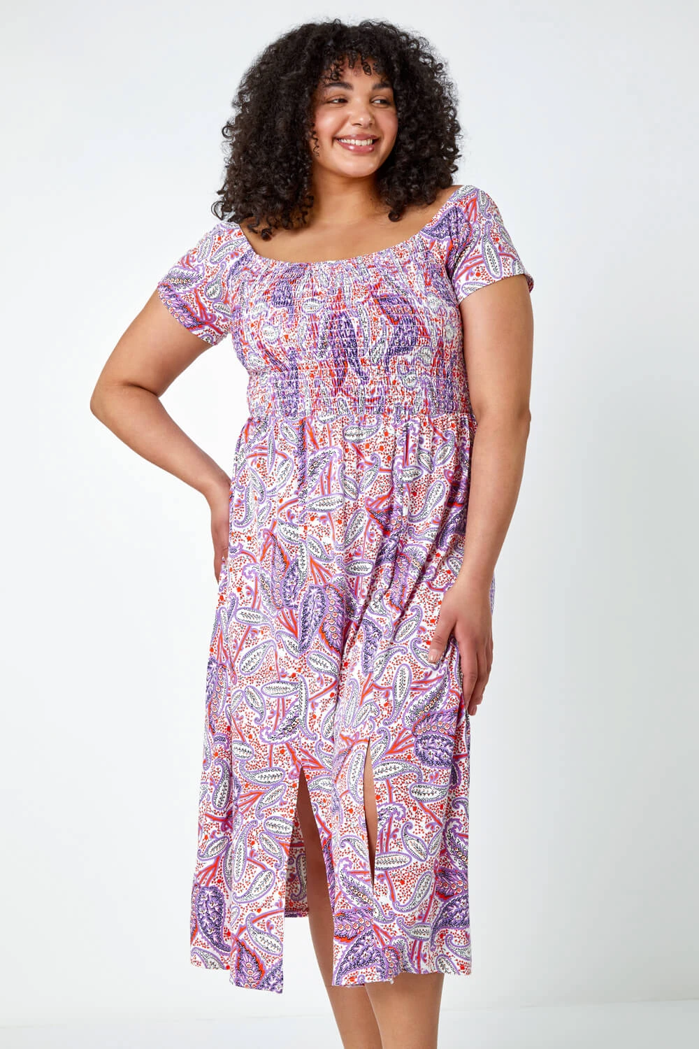 Add some comfy printed styles to your Summer wardrobe for quick and effortless dressing this season. This Curve dress is cut from a cool and comfortable stretch jersey fabric and features a unique elasticated square neckline that can be worn on or off the shoulders, and simple short sleeves. Adorned in a sweet leaf print this dress has an entire shirred bodice for ensured comfort throughout. Designed to pull on overhead, this midi skirt is perfect for relaxed Spring days and holiday sightseeing – simply add a denim jacket & sandals!
