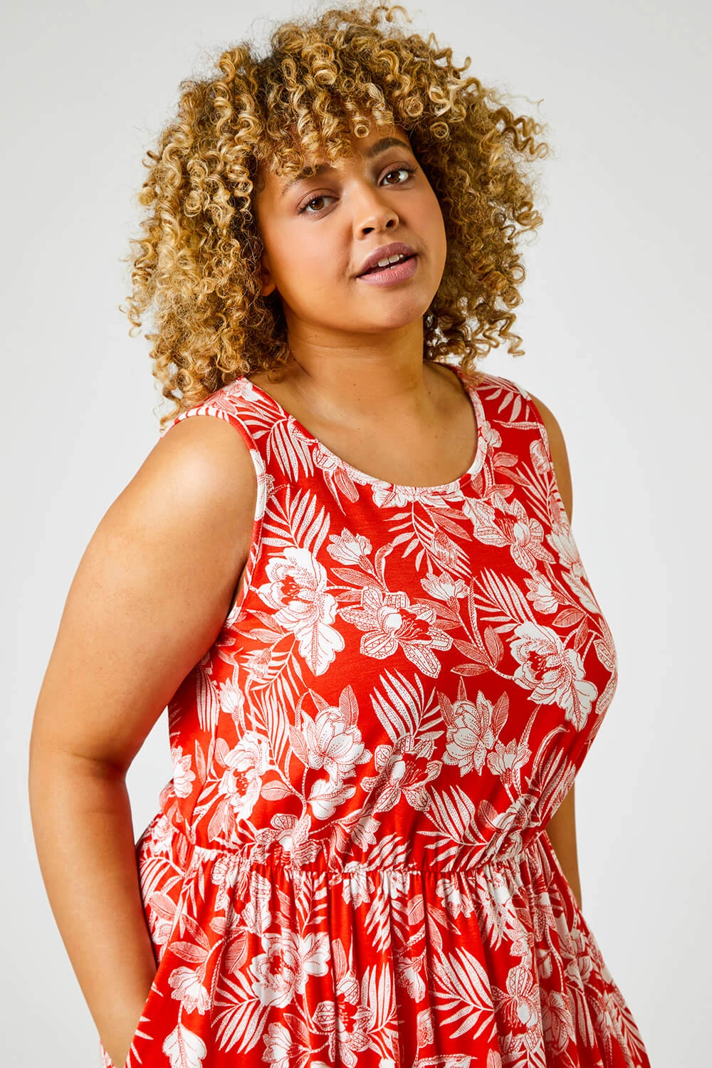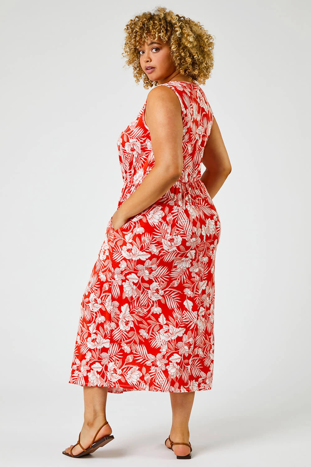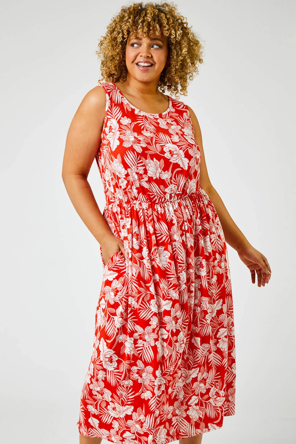 Breezy through sunny weekends and holidays abroad with our Roman Curve tropical floral print maxi dress. This pull on number features a round neckline, sleeveless with an elasticated waist and front pockets. Flattering and eye-catching this dress is the ultimate go to this season, easily dressed up or down, paired with a cardi with warm summer evenings or a denim jacket for those summer days out by the beach!