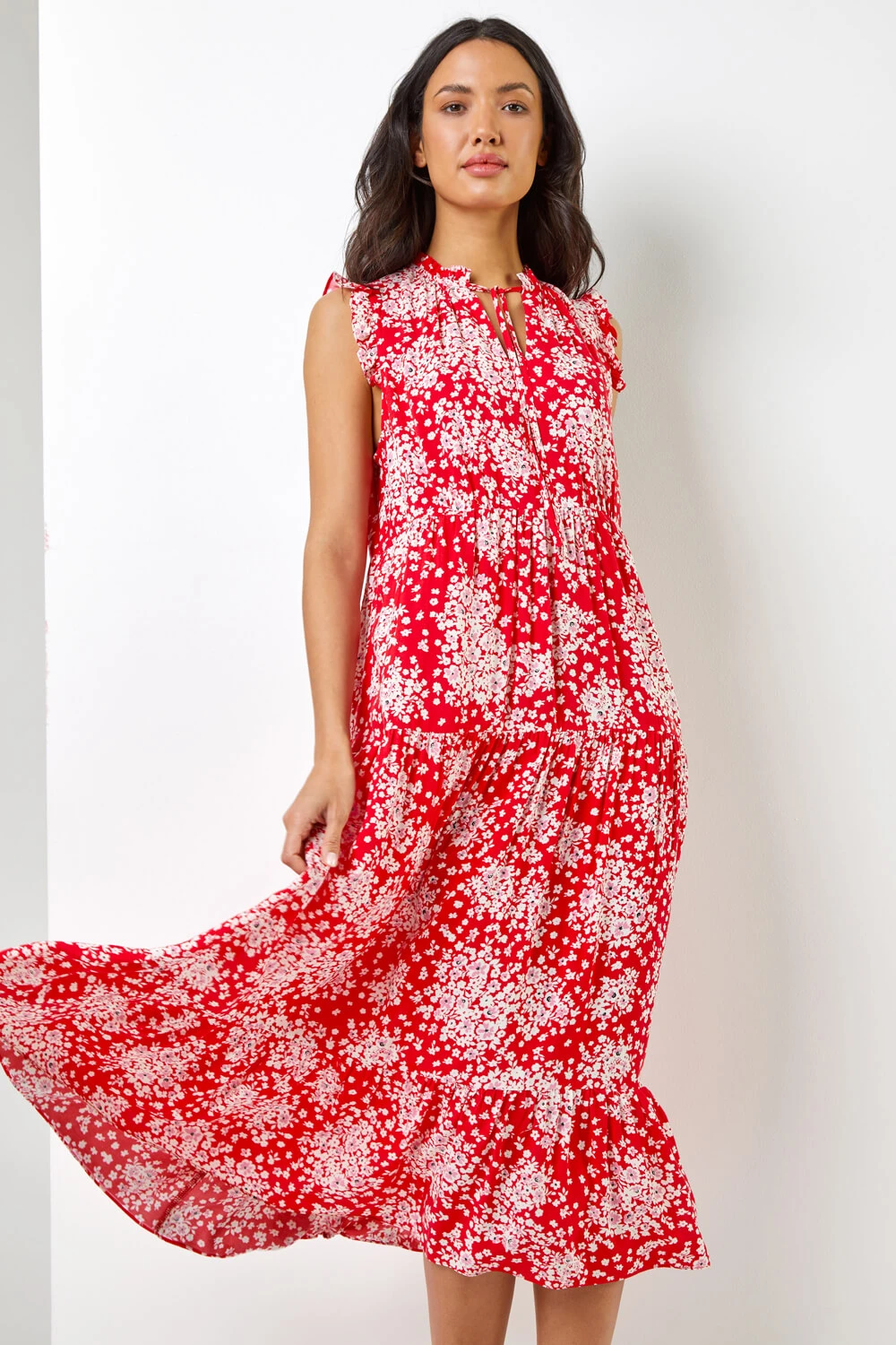 Ditsy Floral Print Frill Detail Maxi Dress Flourish in florals with this exquisite Roman maxi dress. Made with such a seamless silhouette, with frill detailing along the neckline and arm holes, with a neck tie detail that flows into a flattering tiered skirt. This dress is the ideal piece for this upcoming season, elegant and equally stunning, it’s a dress that needs minimal styling. Pair it with some sandals and a crossbody for a made up day look or wedges and a sun hat for an effortless summer look!
