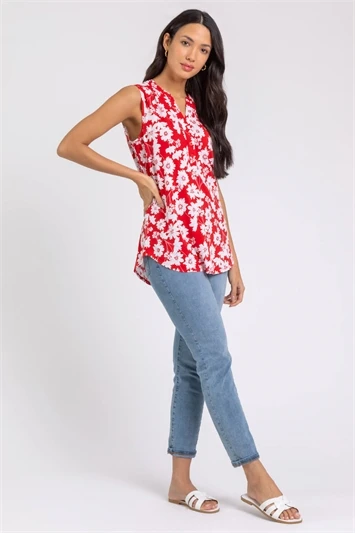 Taking you straight to the summer sun with this floral printed Roman vest top. Featuring a round neckline with gather detail, this sleeveless vest has a double layer material and a longline back with split detailing at the hem. This top is perfect for your casual-wear collection, pair with your everyday trousers or dress it up with statement jewellery and some sandals for a beach to bar outfit.