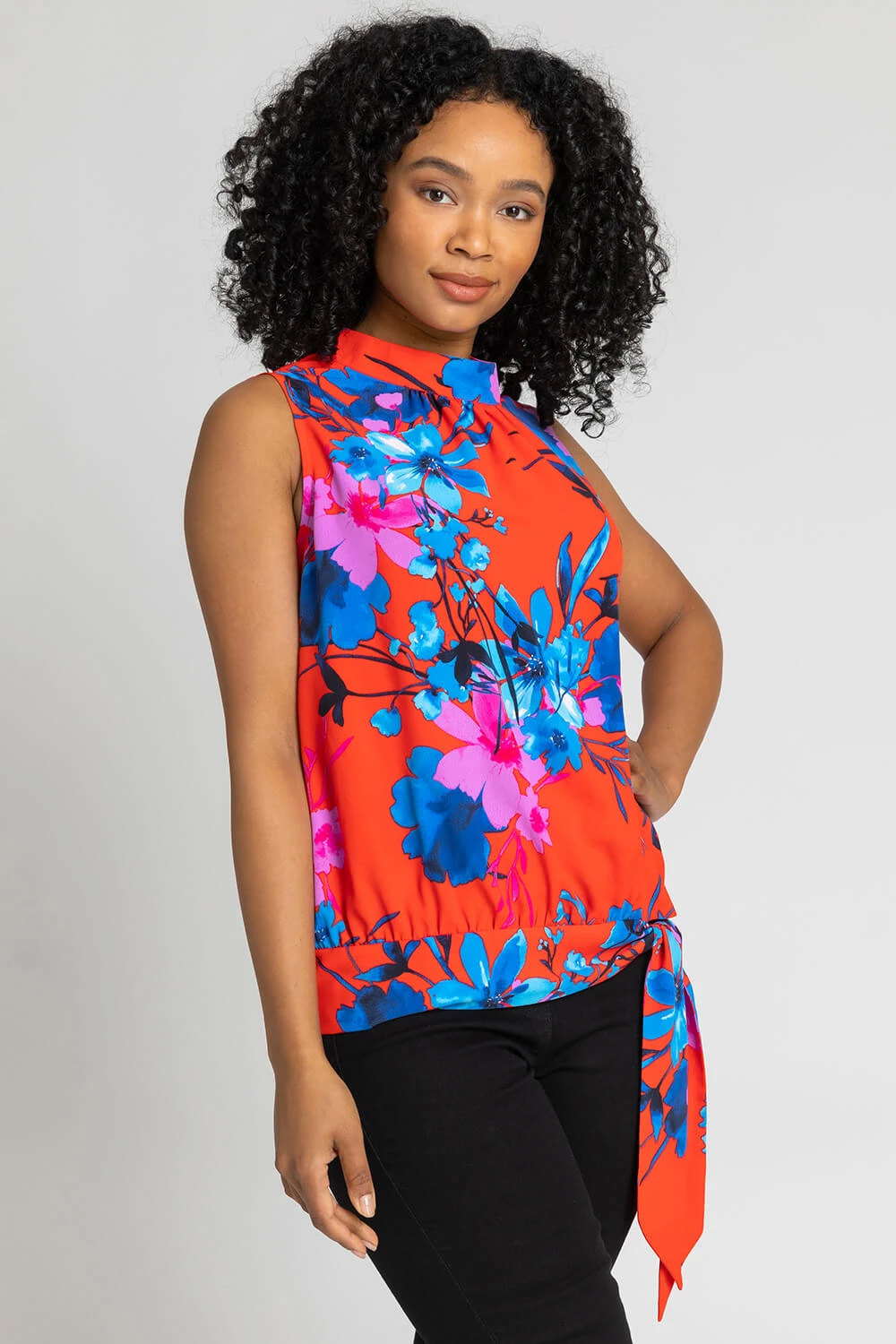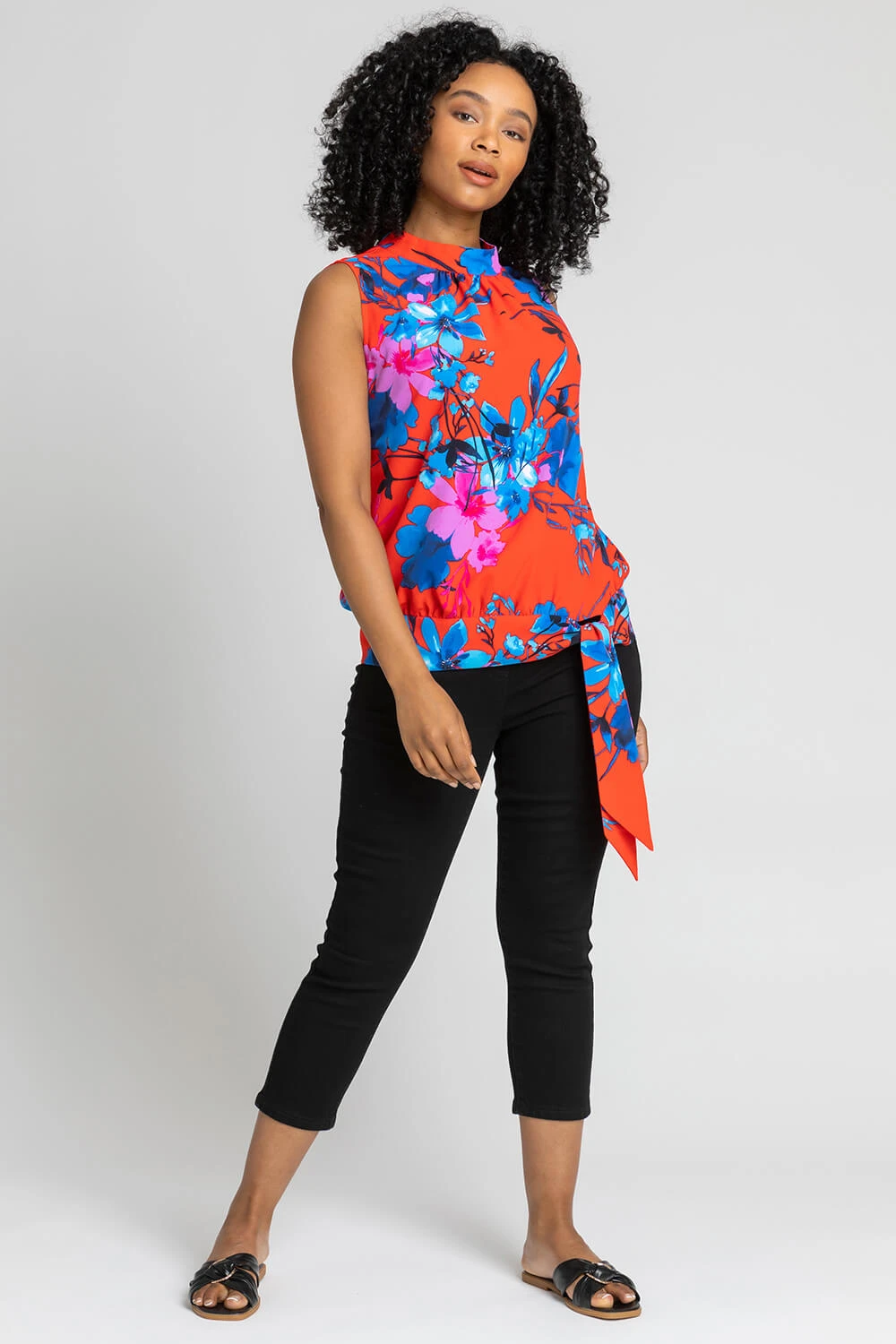 A stunning shade for summer, this bold floral top has gorgeous bright colours and a trending silhouette. Perfect for when the weather gets warmer, this sleeveless style can be worn on its own or with a light shrug. A staple piece for taking abroad, our new tie waist top has a flattering high neckline and blouson style hemline. Complete the look with a plain maxi skirt or keep it casual with a white cropped trousers and statement earrings!