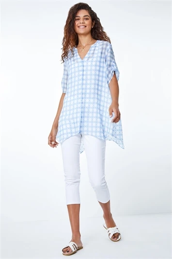Get spotted in this ditsy polka dot blouse from the Spring collection. Cut from a lightweight woven fabric, this 3/4 sleeve Roman blouse is the perfect option for smart casual Summer days. Designed with a high low dipped hemline, classic button down fastening and shirt collar, this longline style is both modest and trendy. This shirt is perfect to wear with cropped trousers and your favourite sandals for a sunny day at the beach.