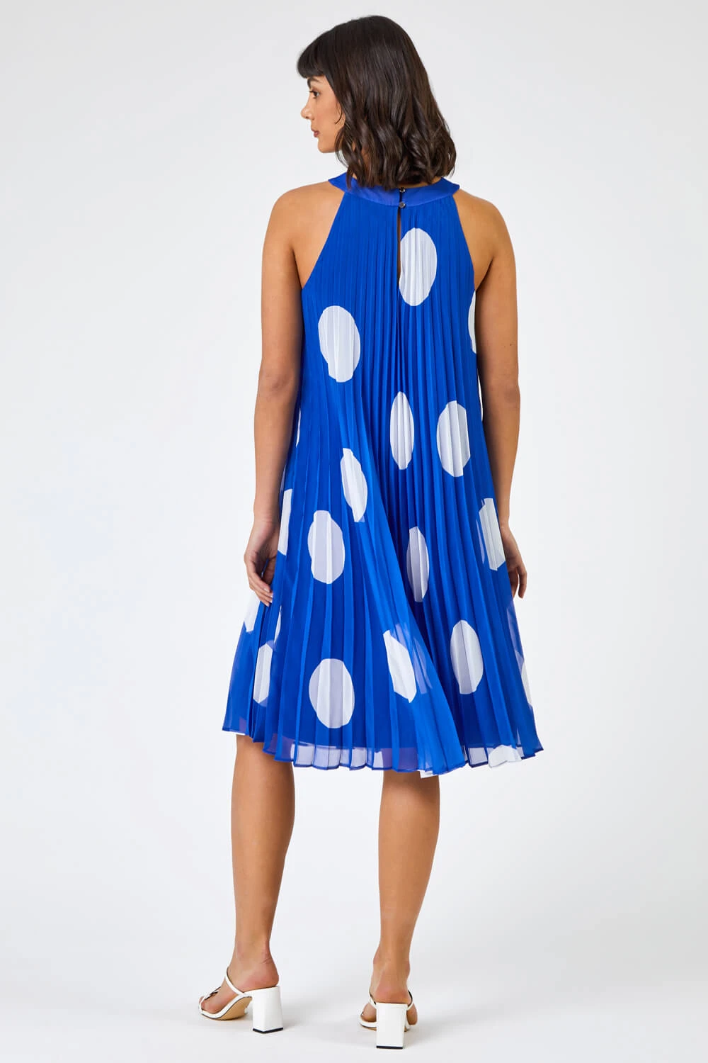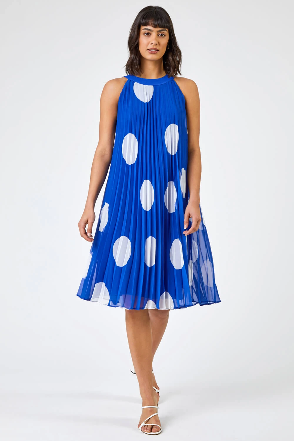 Swing into the new season in your new pleated polka dot dress. This elegant number is fashioned from a lightweight floaty material and cut to a loose flattering silhouette with delicate pleating. This chiffon dress is completed with a keyhole back detail and fastening, pair this timeless piece with some statement heels and a chic bolero for a feminine and classic look for any occasion.
