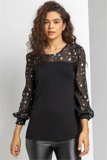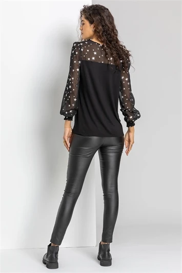 Be star of the show with this curve, star print chiffon top. Cut from a smooth, woven fabric this piece features a v neckline and full length, sheer sleeves with elasticated cuffs. It’s adorned in a striking, metallic star print and comes complete with a matching necklace. A soft jersey under and contrast back provide extra comfort. Pair with our curve leather look trousers for an out of this world outfit!
