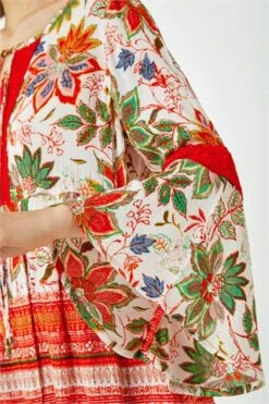 Step into the Summer with neutral prints and relaxed silhouettes. This overshirt has a bold statement button at the front, a feminine v-neckline and short batwing sleeves. It’s designed from a loose woven material for a comfortable and breezy everyday fit. Pair this ikat printed tee with a pair of cropped trousers and wedges for a stylish casual Spring Summer look.