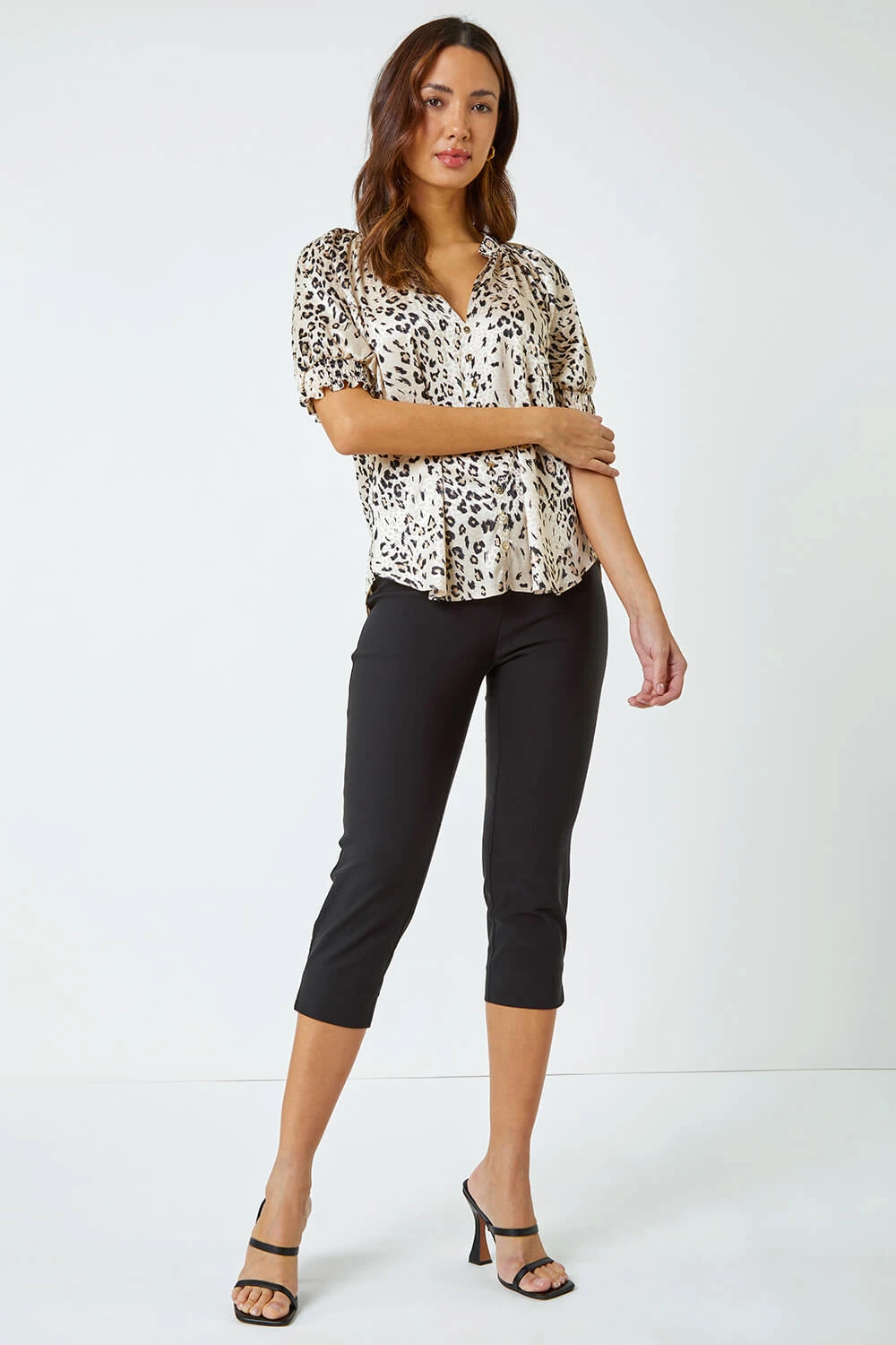 Classic animal print combines with luxurious satin fabric to create this timeless, woven top. Cut from a stretch, woven fabric this piece features a feminine notch neckline and short puff sleeves, finished with elasticated cuffs and a delicate frill trim. Pair with our cropped stretch trousers or faux leather leggings and heels to complete the look!