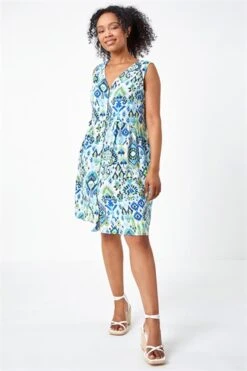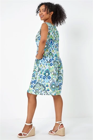 Tick off this season’s new trend with this vibrant, Petite Aztec print dress. Designed in a simple sleeveless silhouette, shape is provided with complimentary shirring at the waist. This lightweight midi dress is designed to pull on overhead, for an easy option for a chic yet comfortable look this Summer. Pair with some sandals and a lightweight jacket for a breezy holiday look!