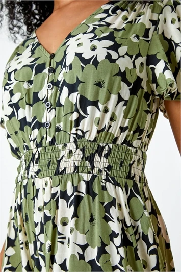 Adorned in an eye catching paisley print, this V-neck dress radiates Summer. With a flattering fit and flare shape this dress features an elasticated waistline for comfort and shape. It features sun-ready short sleeves and is finished with a flirty frilled hem. Cut from a smooth woven fabric this dress is the perfect paired with heeled wedges for an easy and stylish holiday look!