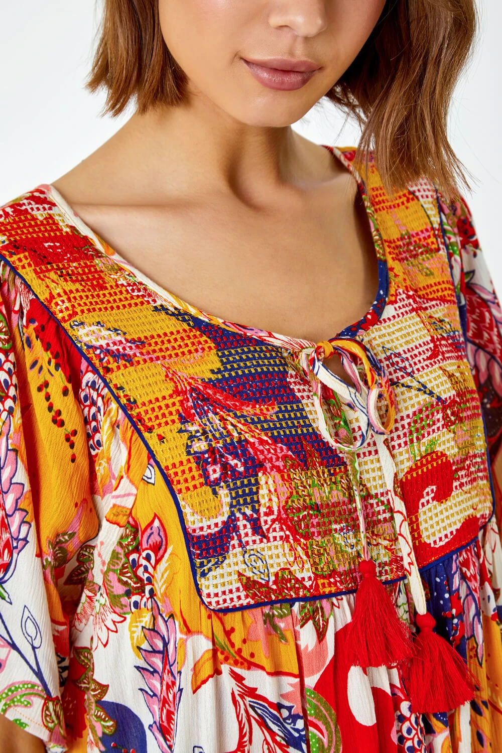 Style and comfort combined, this sun-ready dress has casual written all over it! It features a short sleeve silhouette with a subtle dipped hem as well as a fashionable tropical print design and tassel tie detail. This feminine favourite has a frill at the hem and flattering v-neckline. Crafted from a light woven material with a unique stitch detail, this smock dress is sure to turn heads on the beach. Ideal for throwing over your holiday swimwear or keeping cool at home, this everyday dress is a Summer staple.
